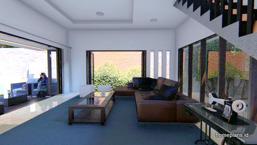 Ruang keluarga bisa menjadi ruangan yang cukup besar dan lega dengan pemandangan taman taman kering di sekelilingnya. Adapun kamar mandi untuk bilas bisa diakses dari teras depan tapi bila tidak ingin terlihat mencolok bisa juga ditutup dengan tembok permanen atau ada pintu dari arah teras depan. Adapun untuk Lantai duanya terdapat tiga kamar tidur, dengan salah satunya merupakan kamar tidur utama dengan kamar mandi dalam. Bila diperhatikan pada lantai dua bisa dibikin tangga untuk naik ke lantai 3, dimana lantai 3 digunakan untuk tempat cuci jemur. Hal ini juga karena keterbatasan lahan sehingga tempat cuci jemur bisa berada di lantai paling atas.