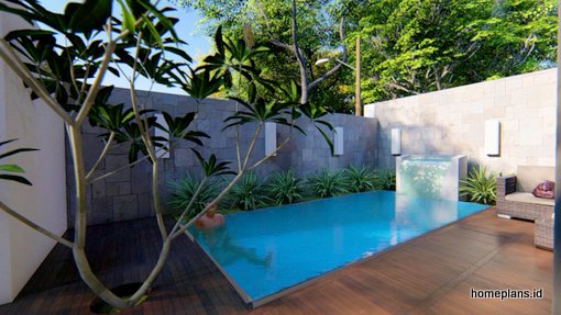 Bila kita perhatikan desain kolam renang yang berada di depan, bisa memberikan nuansa yang menyegarkan, begitu masuk ke dalam area rumah. Selain itu kita bisa mencoba hal yang baru; berupa kolam renang yang diletakkan di bagian depan rumah. Adanya tembok pagar yang tinggi di depan juga memberikan privasi pada area kolam renang tersebut. Secara umum kesan etnik yang ingin ditampilkan adalah unsur atap perisai, dan juga unsur batuan yang merupakan saduran dari arsitektur tradisional kita.