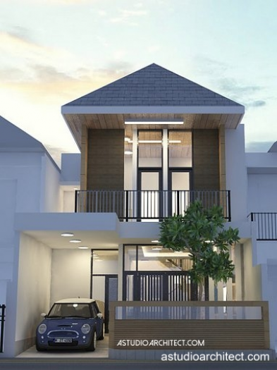 homeplans.id Untuk membuat rumah terlihat megah, desain ini menggunakan atap dengan kemiringan 45 derajat, yang membuatnya terlihat lebih tinggi dan elegan. Jendela dan pintu yang tinggi hingga ke plafon juga memberikan ilusi bahwa rumah lebih megah, sekaligus memberikan cahaya yang maksimal kedalam ruang-ruang, mengingat rumah ini tidak memiliki taman dalam. Selain itu dibagian atas tangga atapnya bisa menggunakan atap transparan seperti kaca yang diberi celah untuk aliran udara.